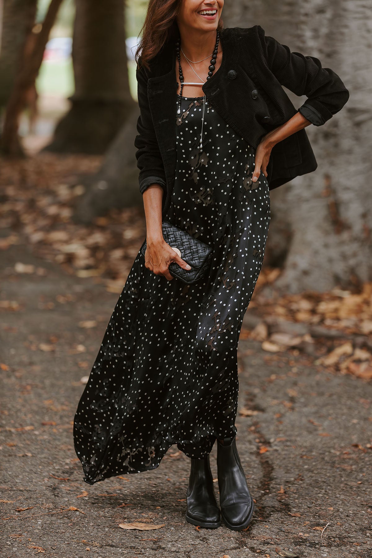 The polkadot burnout silk is the fabric of the moment and perfect for day to evening dressing with ease. We see it playing well with sneakers, boots or heels, cardigans, jackets or alone to show off those sexy shoulders!
